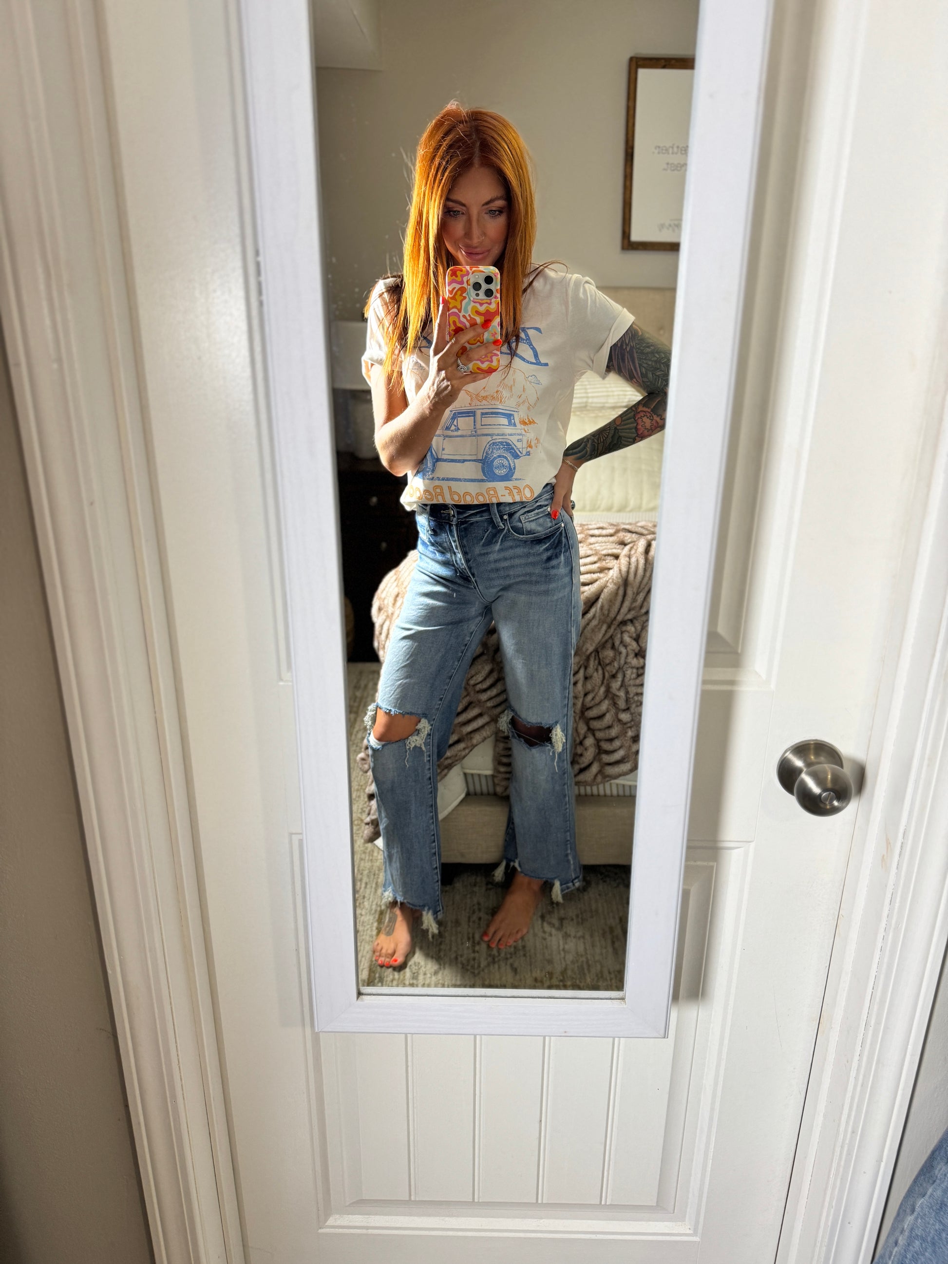 These are that pair—the ones that hold you in, smooth you out, and somehow go with everything. They are a high-rise, slim wide-leg denim dream with the perfect amount of stretch and a raw, destroyed hem that hits just above the ankle (yes, tall girl friendly!).