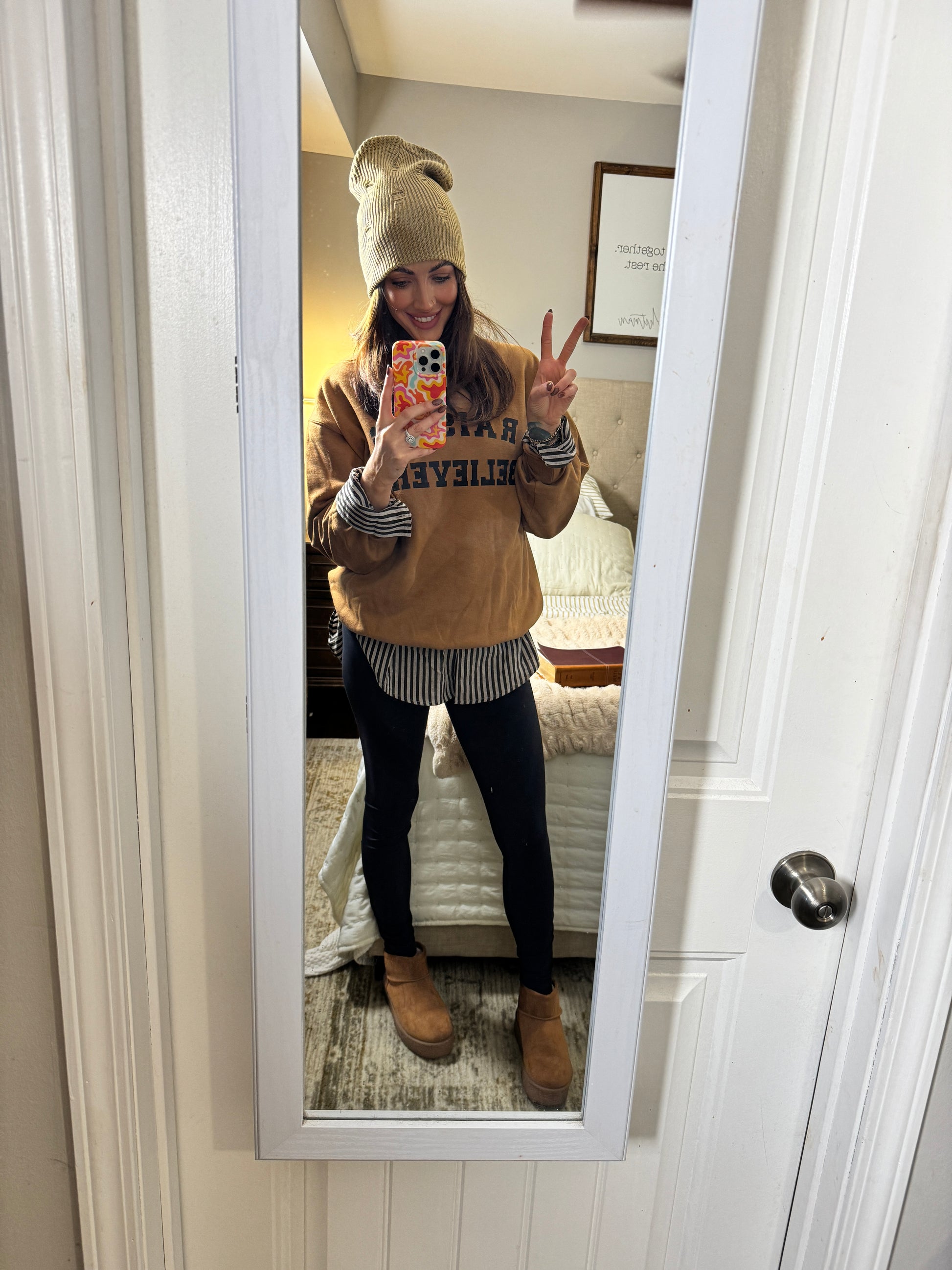This ultra-soft knit in a warm honey-caramel hue is the perfect blend of cozy and cool. Whether you’re rocking messy curls, a sleek pony, or your Sunday sweatshirt look, this neutral tone goes with everything. The slouchy fit gives it that effortless, lived-in vibe that looks chic without trying too hard.