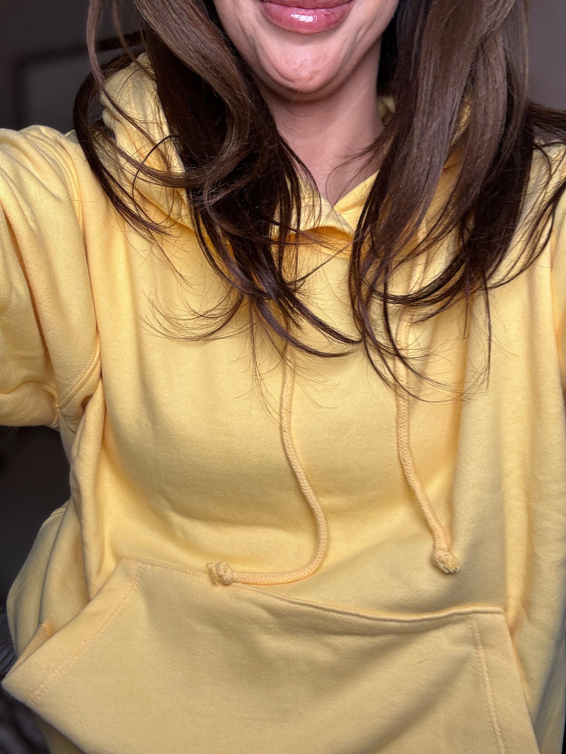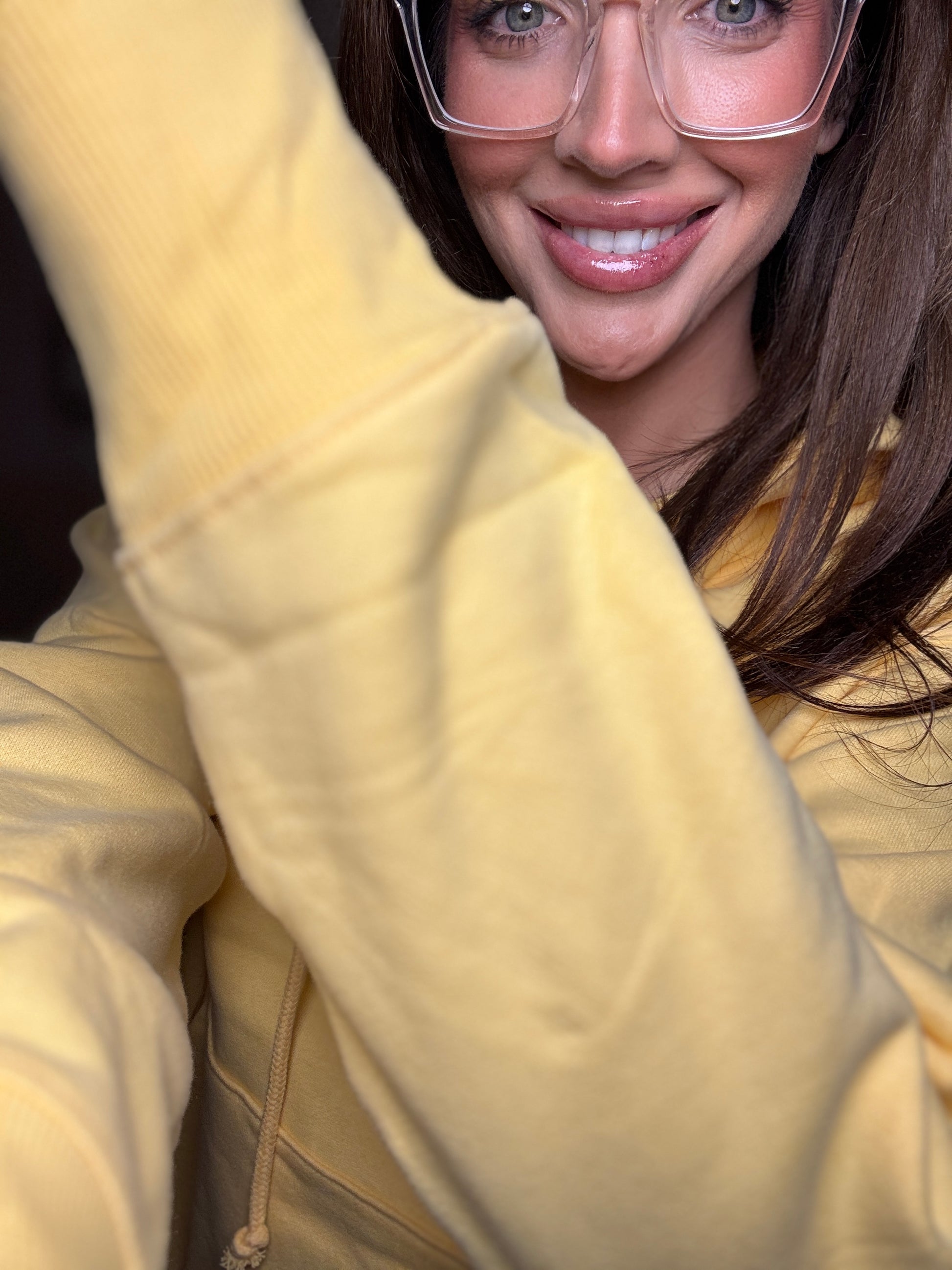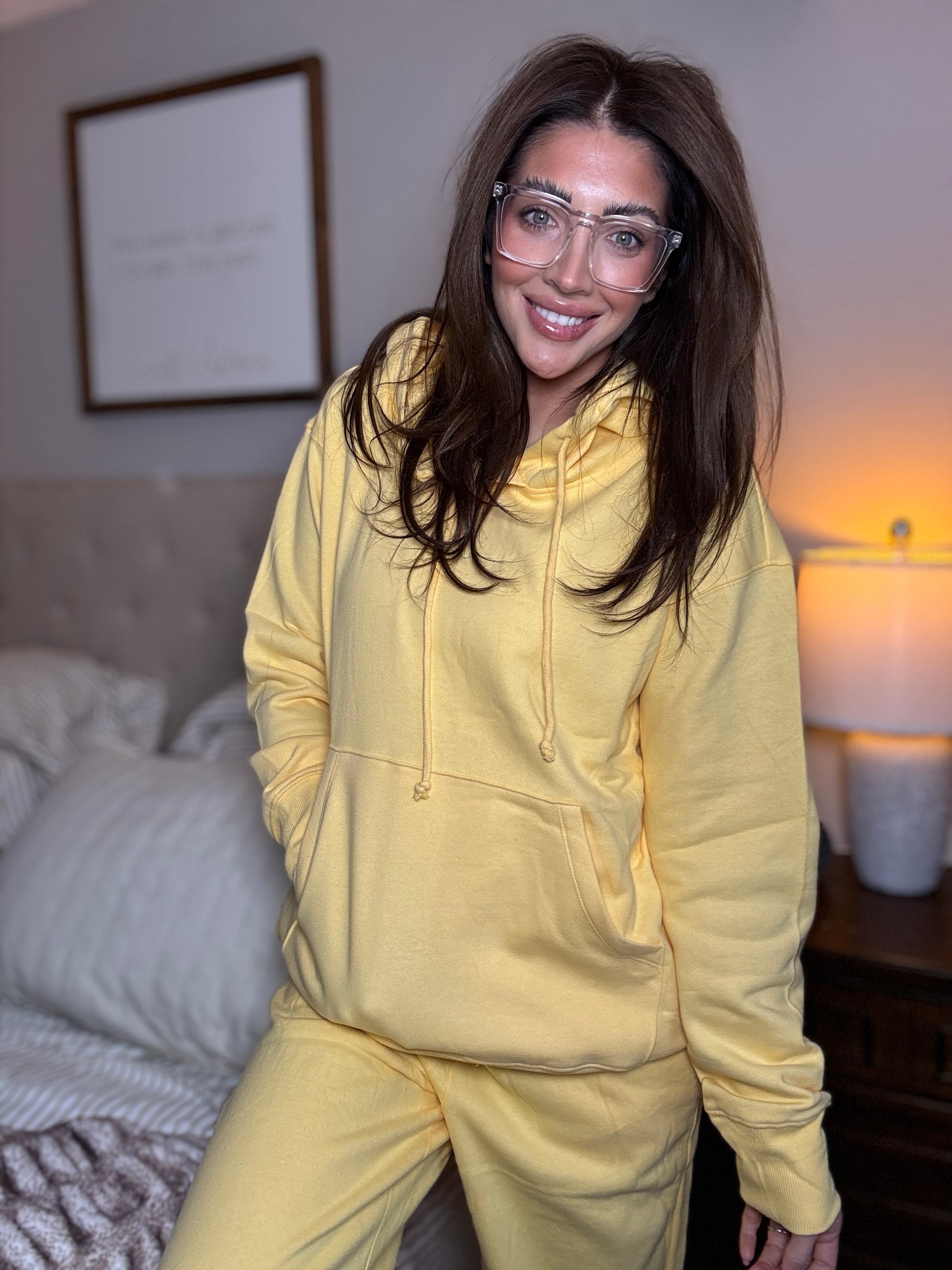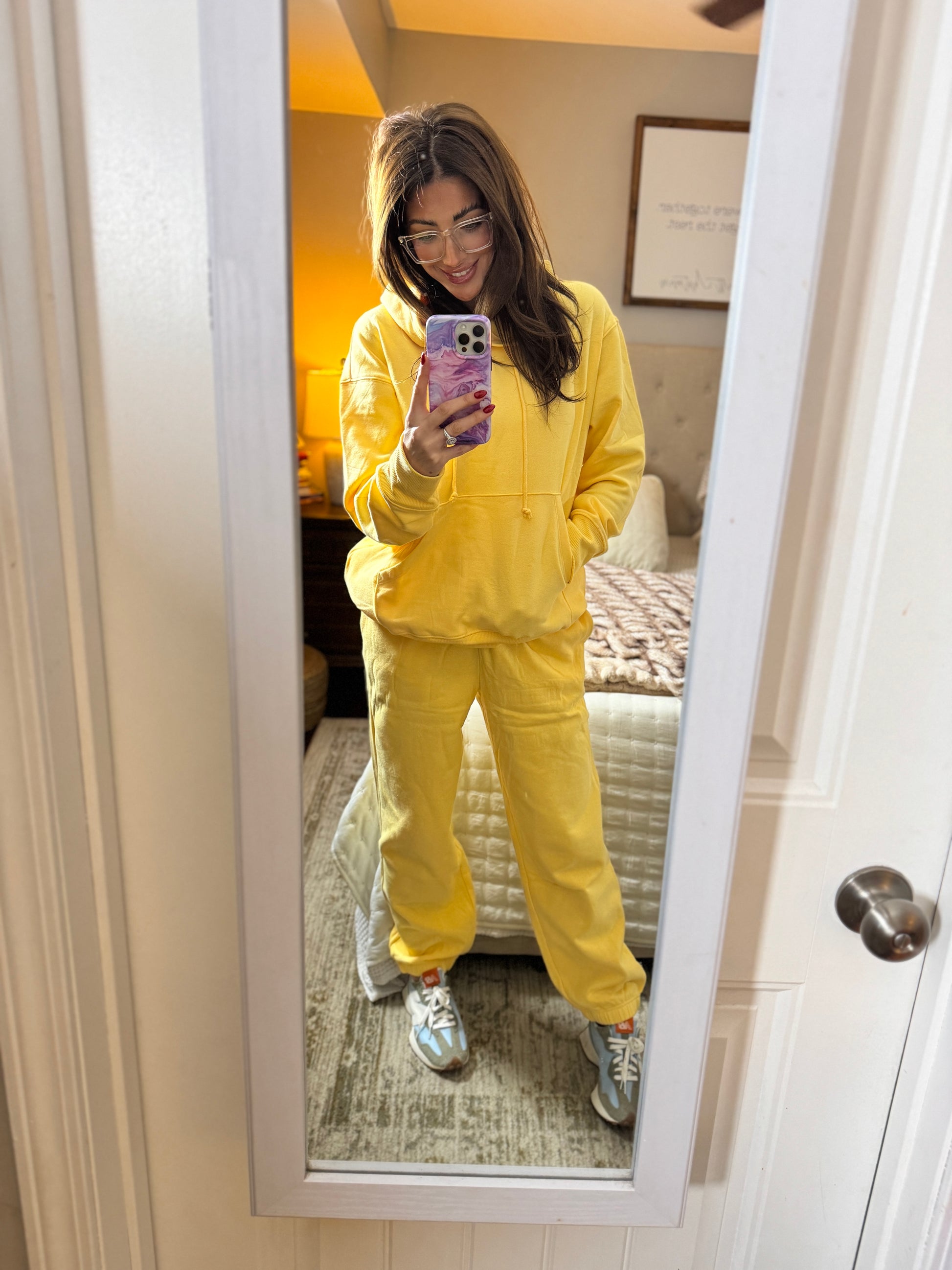 I’m 5’8” and 135 lbs wearing a small. It fits perfectly — just how I like my sweats — but I dry everything. The medium waistband gives a looser, more relaxed fit if that’s your style. The joggers are high-waisted with a thicker waistband that flatters your shape, and the length is perfection for taller babes. The hoodie’s creamy yellow tone is just the right neutral to mix with denim or black leggings for an easy, bright look.